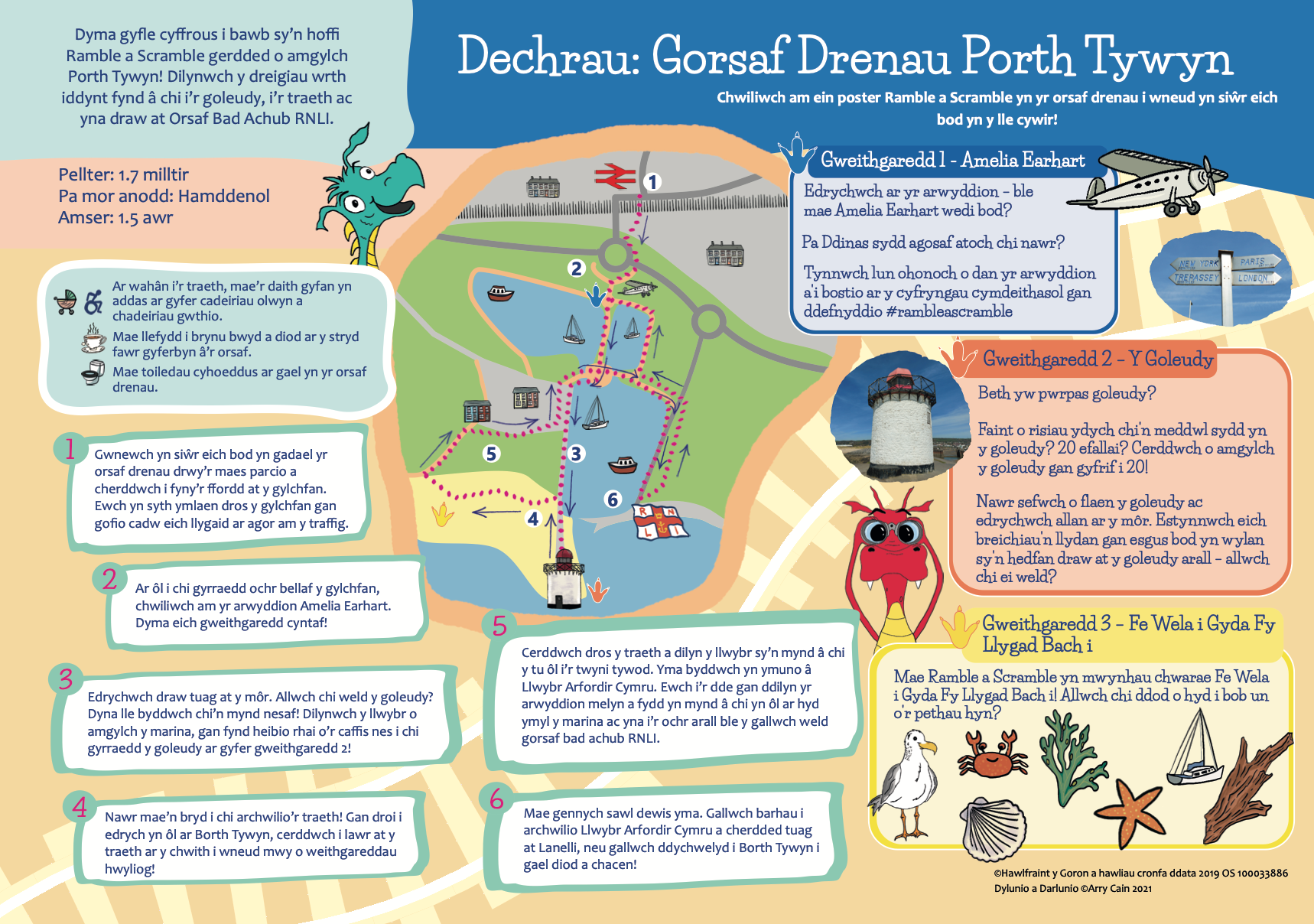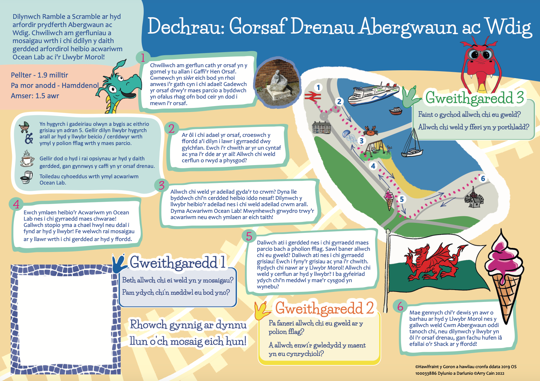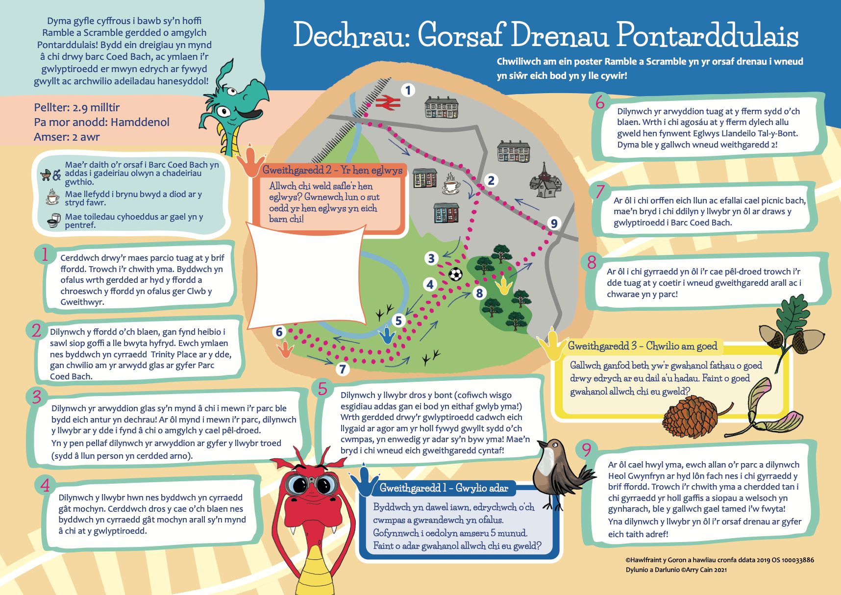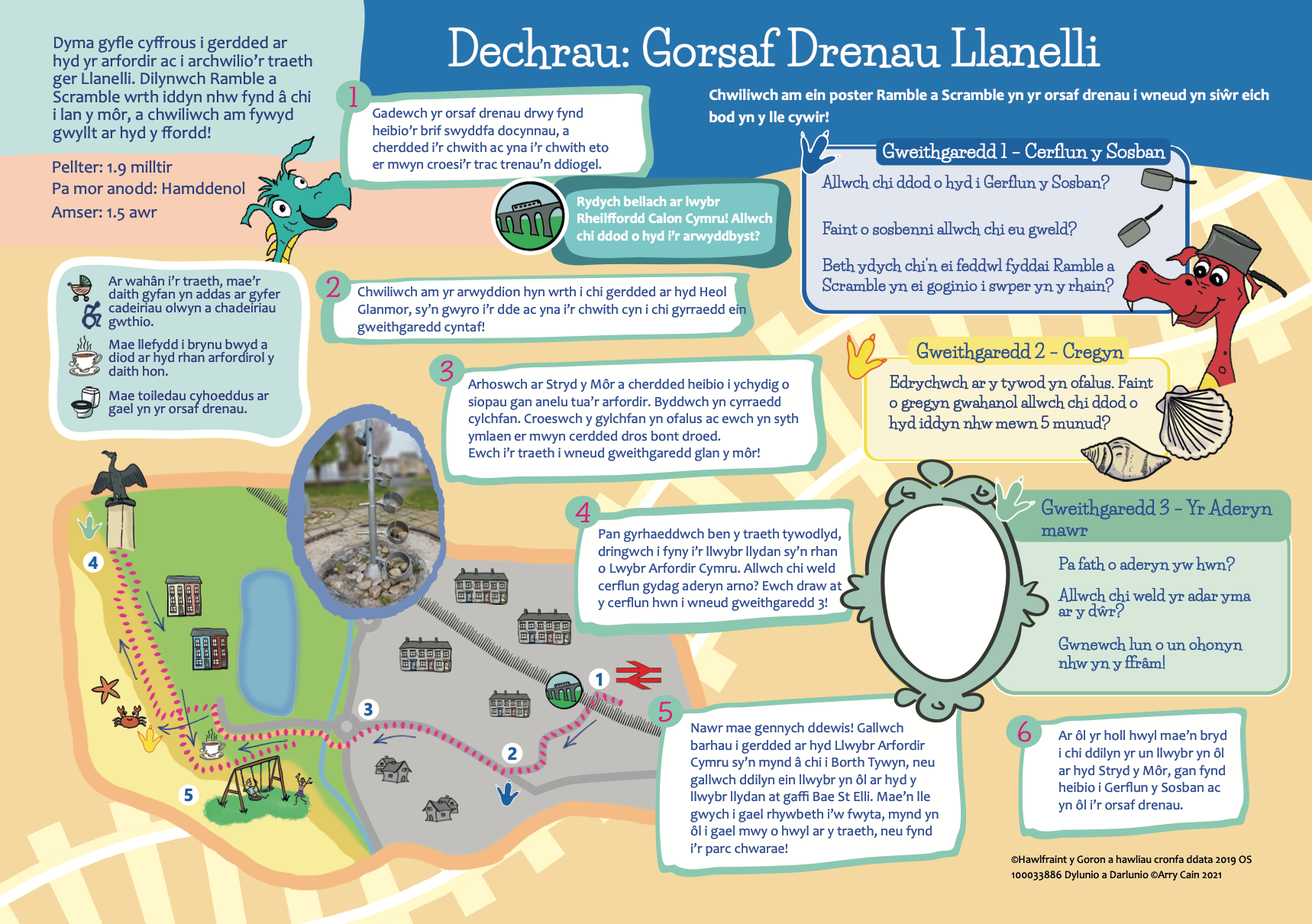 Mae'r teithiau cerdded yn cynnwys mannau o ddiddordeb, a gweithgareddau rhyngweithiol byr, i ymgysylltu â cherddwyr ifanc, magu hyder wrth ddarllen mapiau a gwneud cerdded yn hwyl i bob oedran.